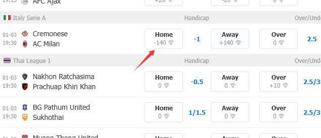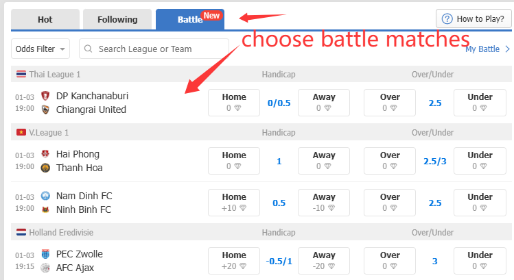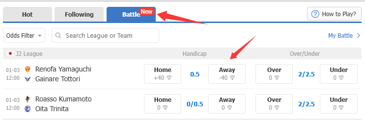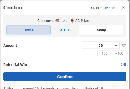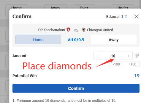 Registered users can participate in Asian Handicap and Over & Under events. Orders (multiples of 10 diamonds) can be placed from 24 hours before the match until kickoff. The number displayed below each outcome option represents the current order difference.