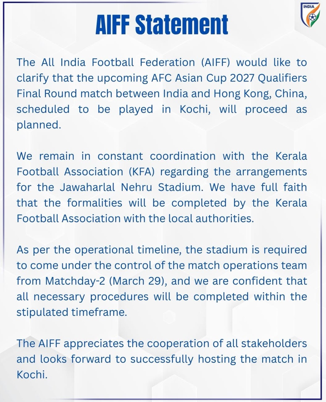 In addition, the Indian men’s national team has already finished bottom of their group in the third round of the qualifiers, missing out on qualification for the 2027 AFC Asian Cup to be held in Saudi Arabia.