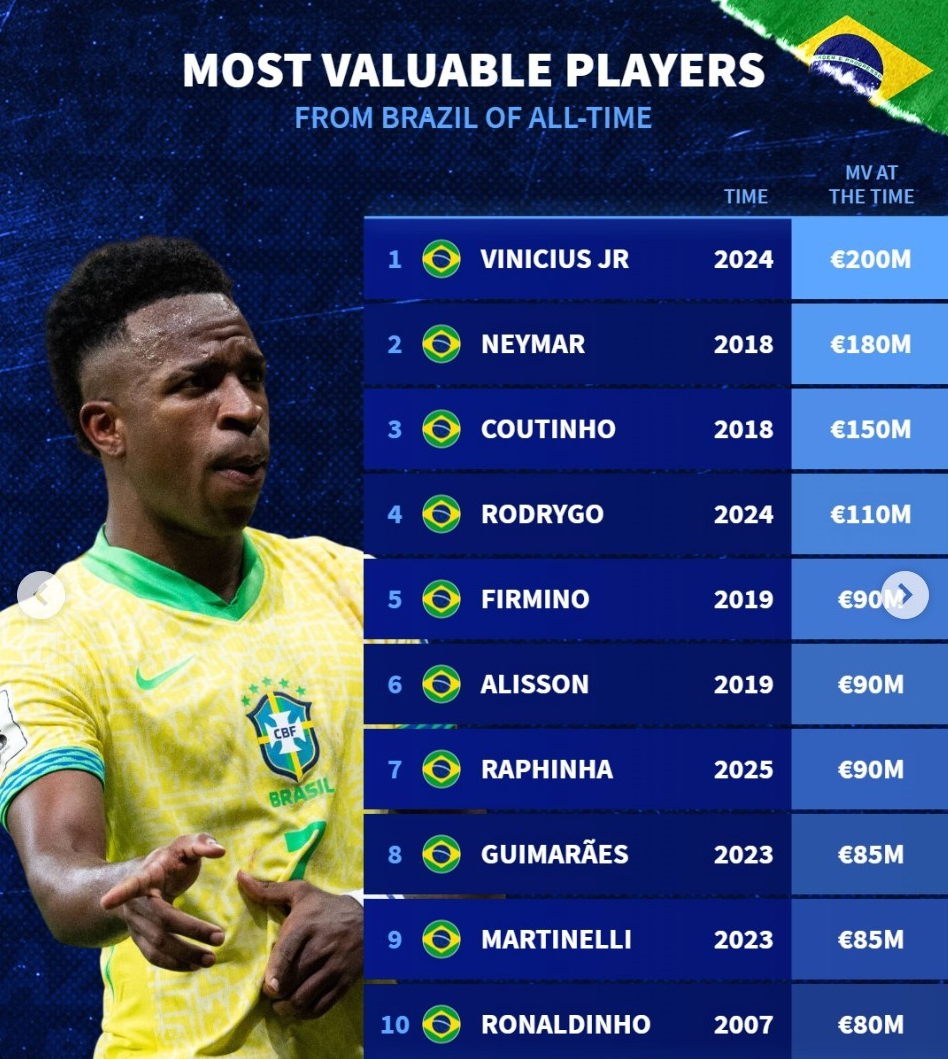 Transfermarkt has released the all-time market value rankings of Brazilian players. Vinícius tops the list with €200 million, followed by Neymar with €180 million, Coutinho with €150 million, and Rodrygo in fourth with €110 million.